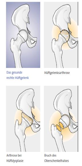 In den meisten Fällen handelt es sich um eine sogenannte primäre Arthrose, das heißt eine Abnutzung der Gelenkflächen als Folge des natürlichen Alterungsprozesses. Bei Arthrose als Folge einer anderen Grunderkrankung z. B. der rheumatoiden Arthritis oder Folge eines Bruchs des Hüftkopfes, der Pfanne oder des Schenkelhalses spricht man von sekundären Arthrosen.